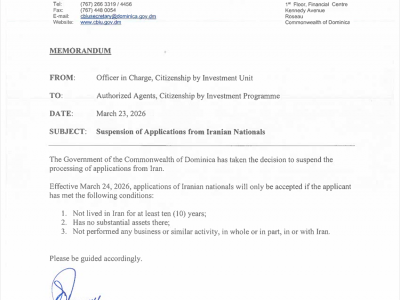 2026年3月23日多米尼克投资入籍局(CIU)暂停受理伊朗国民的申请。该暂停令即日起生效。CIU仅在伊朗国民满